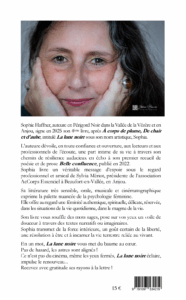 Mercredi 26 novembre à partir de 15h45 jusqu’17h au 16 rue Christian Rabin à Beaufort en Vallée, siège de l’association AcCorps EssenCiel, Sophie Haffner, nous fait l’honneur de venir témoigner de son parcours d’auteure et d’artiste à travers son 4ème livre intitulé La lune noire.